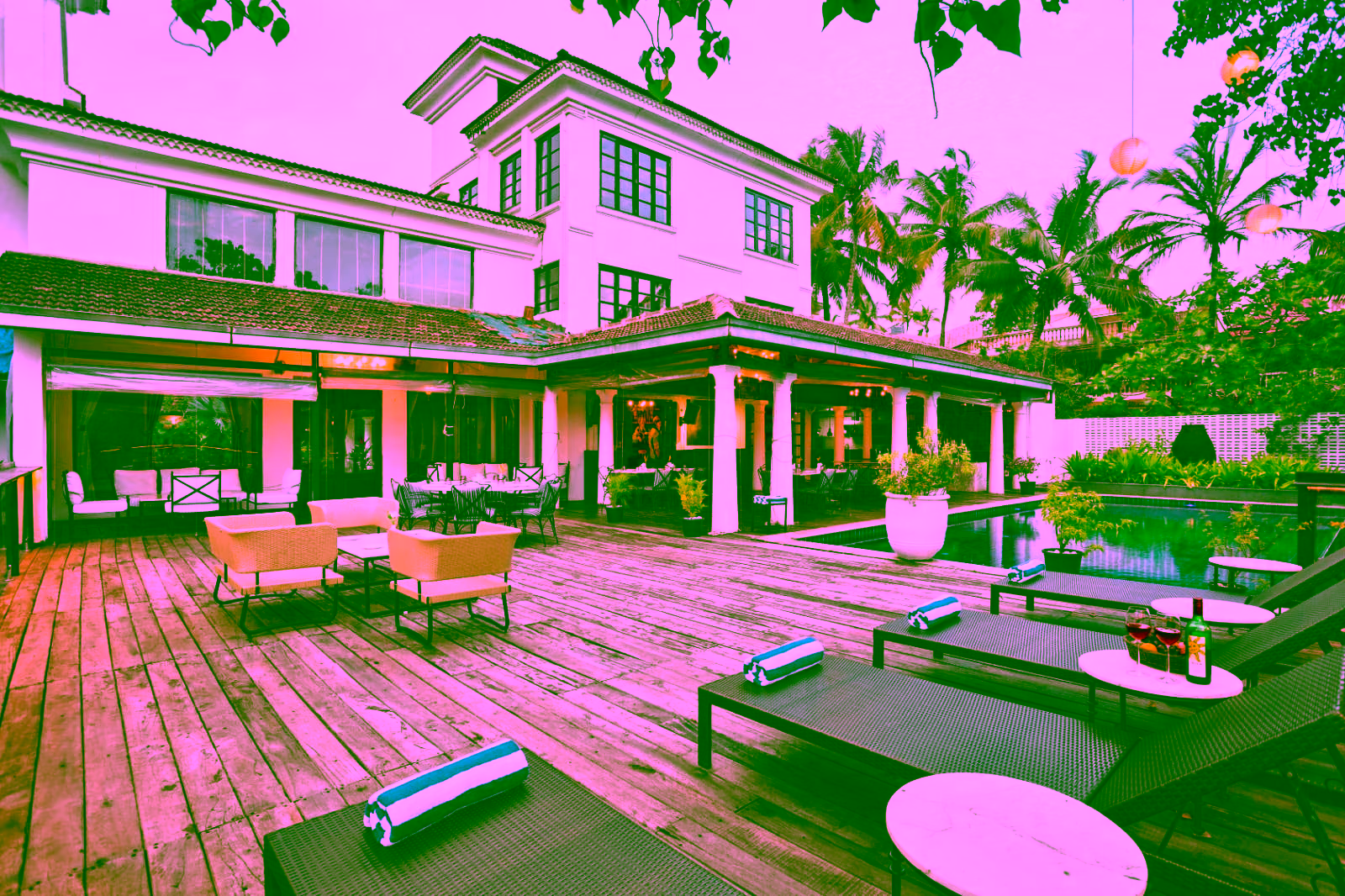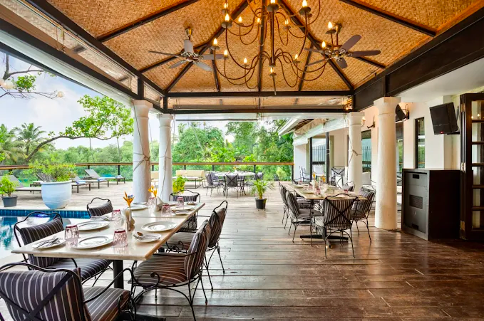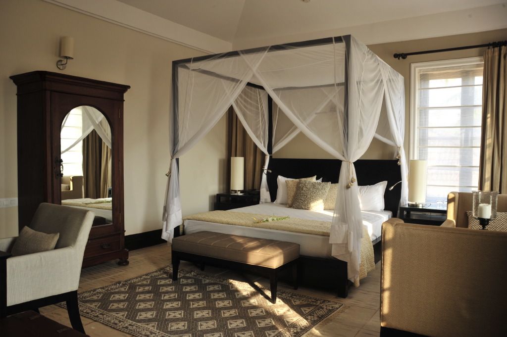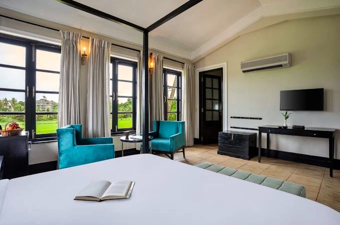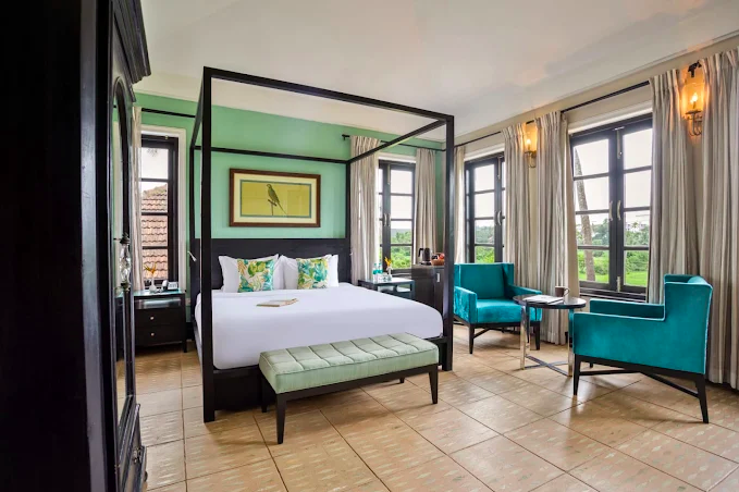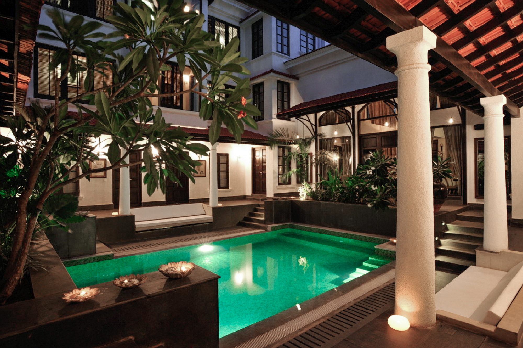 Goan heritage original designed by Tarun Tahiliani and infused with luxury, the hotel opens to a pool courtyard with star-lit sky and a second emerald pool lined